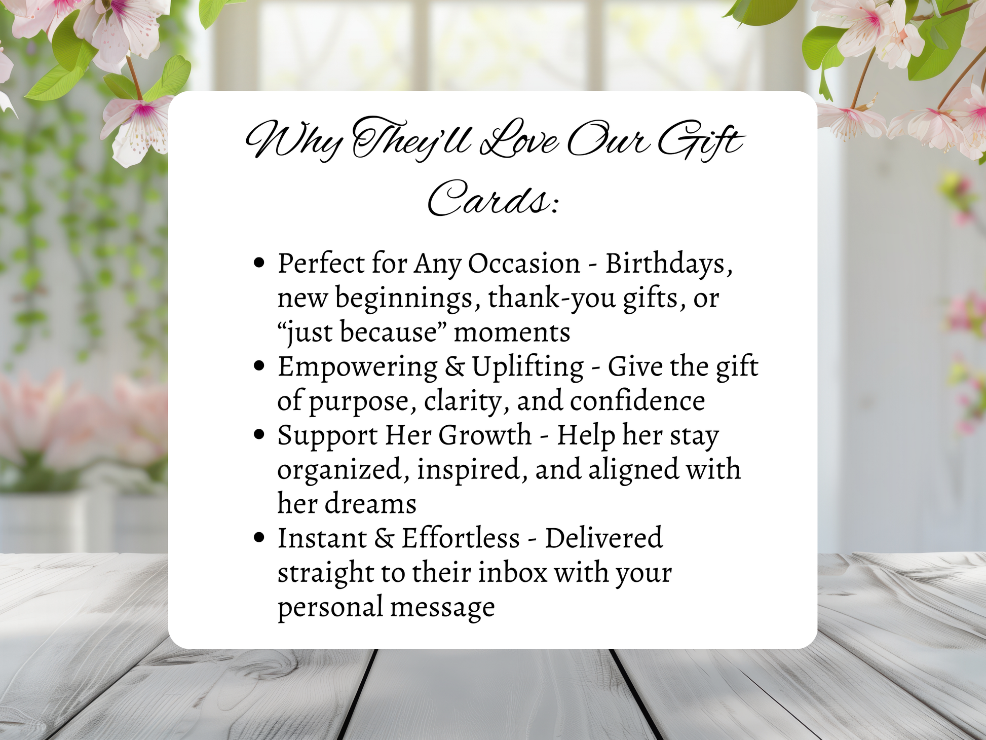 Looking for a meaningful, feel-good gift that empowers and inspires? Our digital gift card is the perfect way to say “I see you, I support your journey, and I want you to thrive.” Whether it’s for a birthday, a new chapter, or just because — this is more than a gift. It’s a nudge toward purpose, clarity, and confidence.