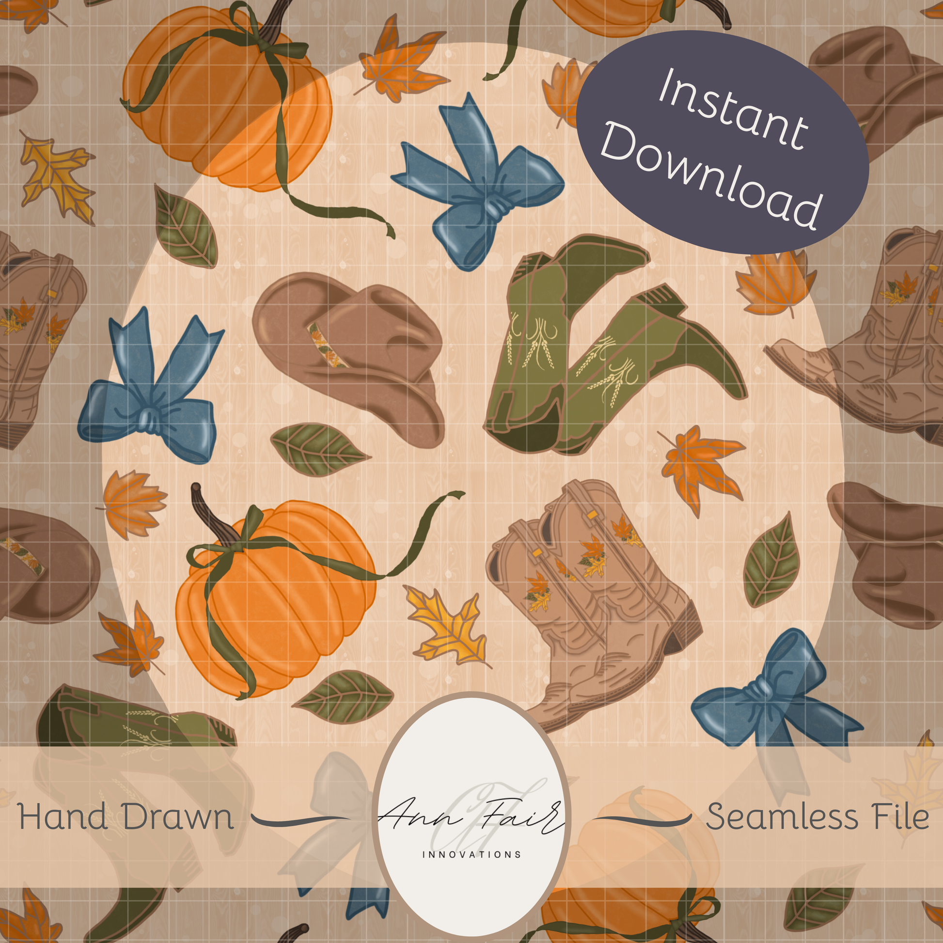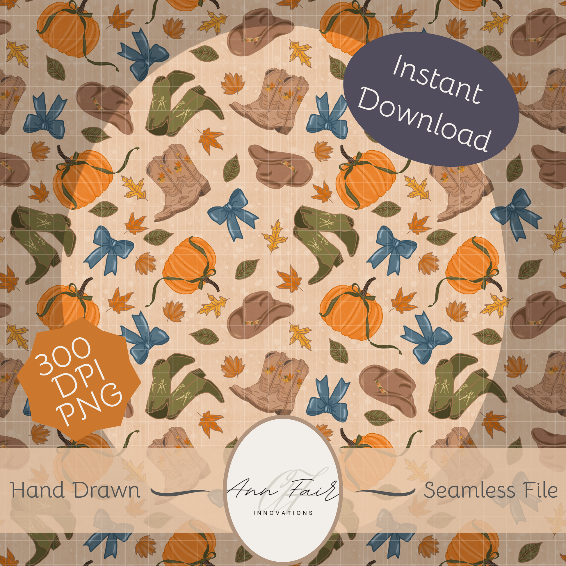 Autumn Cowgirl green boots hand drawn Seamless Digital Pattern | 300 DPI PNG | Instant Download