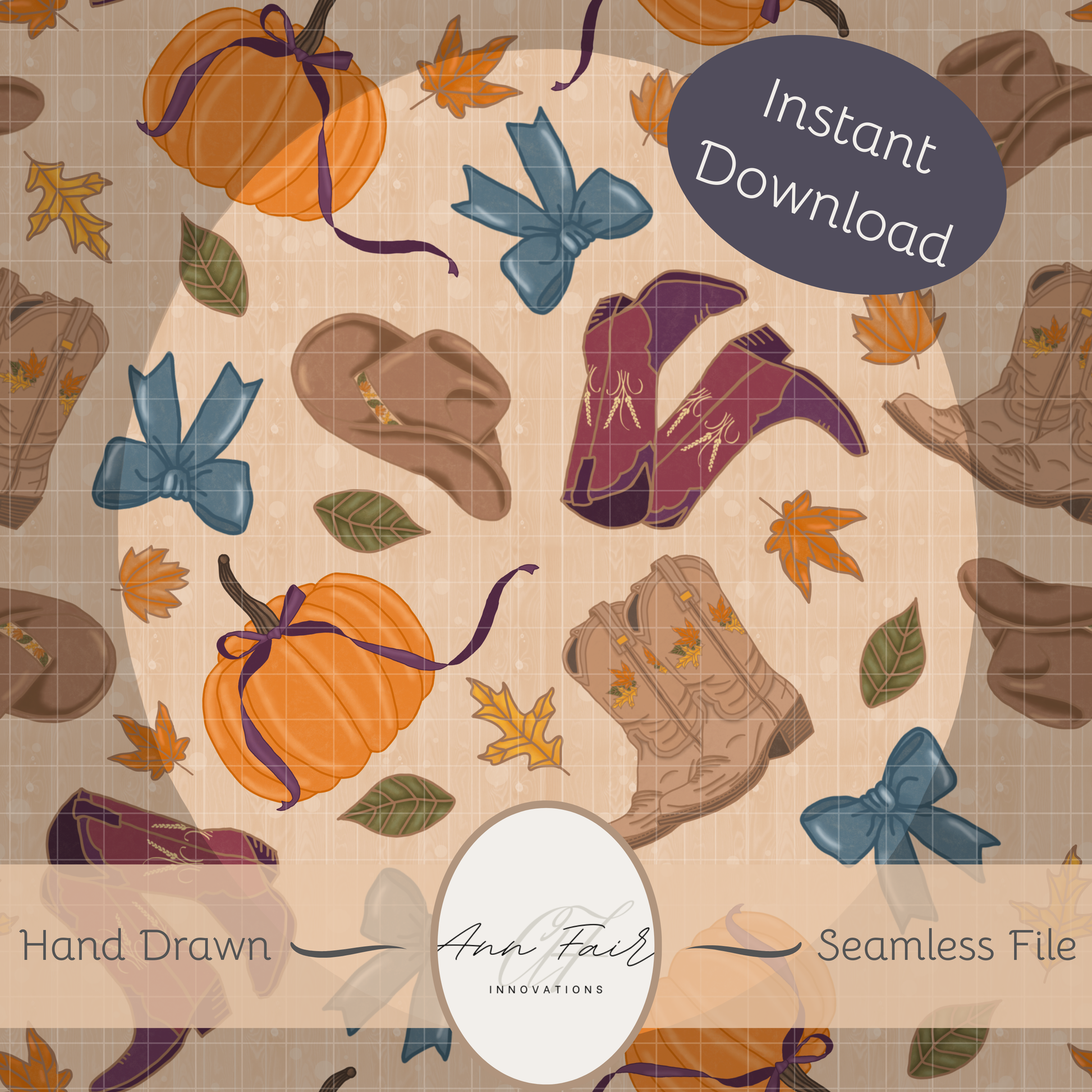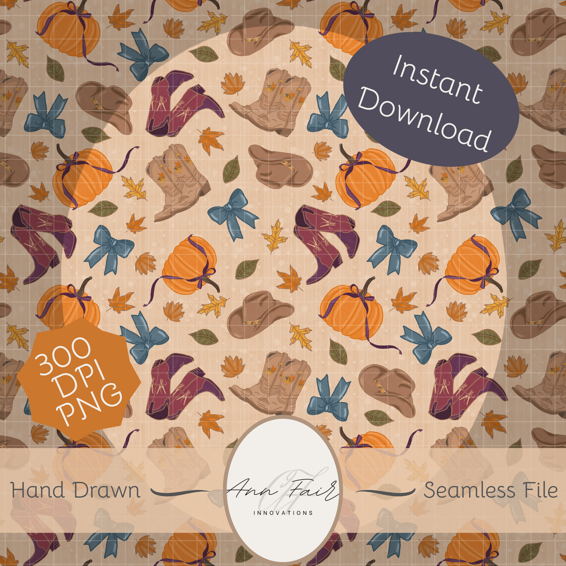 Autumn Cowgirl plum boots hand drawn Seamless Digital Pattern | 300 DPI PNG | Instant Download