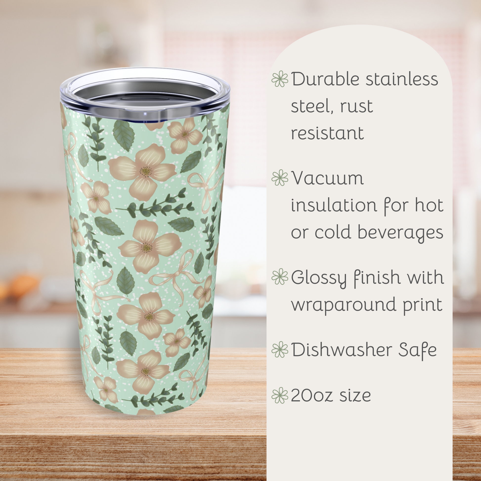 Blush petal garden style tumbler with pretty blush pink flowers, bows, eucalyptus, leaves, and polka dots. It exudes pretty and soothing vibes, perfect for enjoying hot or cold beverages in style. This tumbler is relevant for those who appreciate floral designs and want a chic accessory for daily use or special occasions.