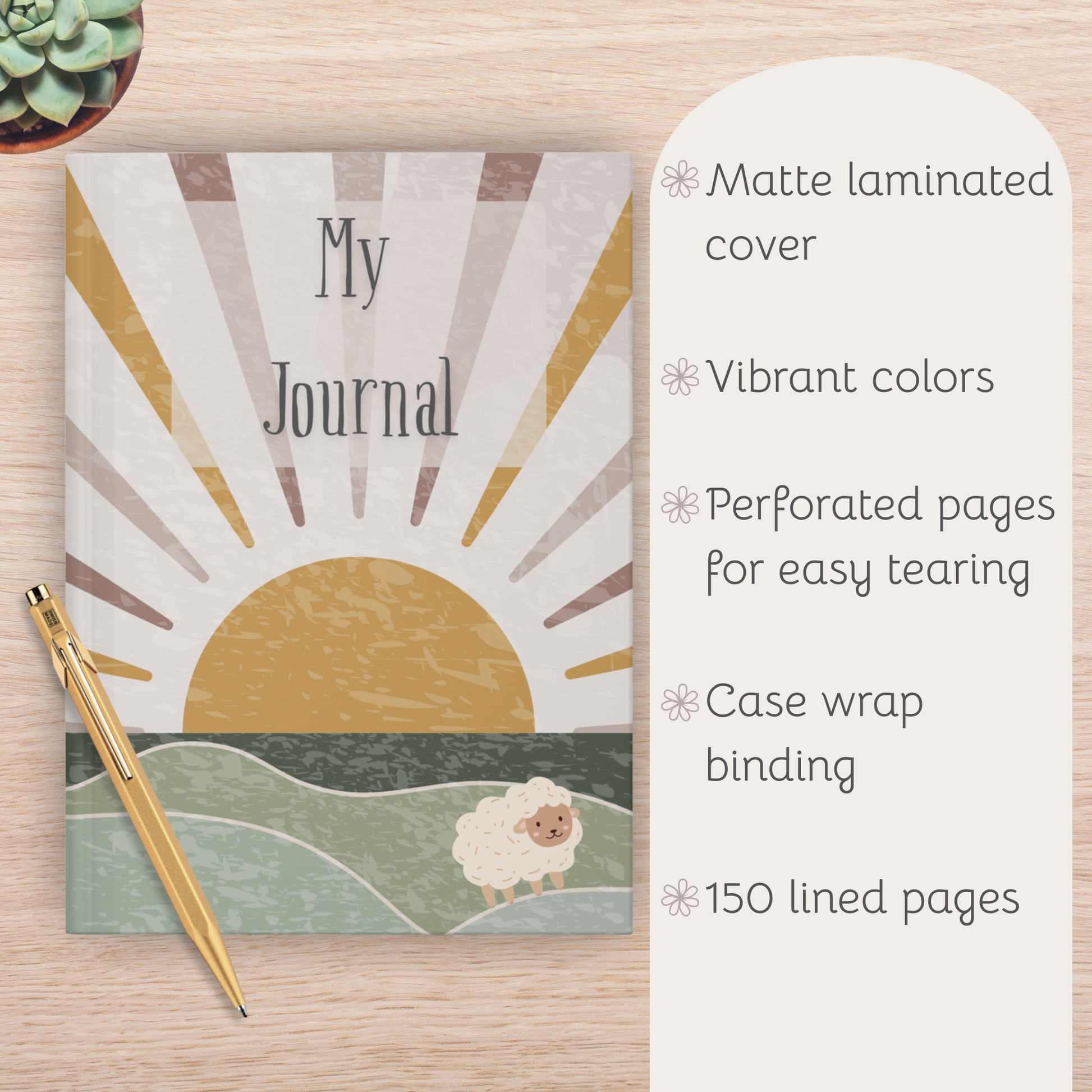 This beautiful hardcover journal features a stunning matte laminated cover that feels smooth and durable to the touch. Bursting with vibrant colors, the design showcases a charming boho sunset that inspire creativity and tranquility. Perfect for jotting down thoughts, sketches, or daily reflections, this journal adds a touch of beauty to any workspace or personal nook. Ideal for writers, artists, or anyone who values self-expression, this journal is a must-have for gifting on occasions like birthdays, graduations, or as a thoughtful treat for friends during the springtime or as part of a Mother’s Day celebration. Embrace the artistic vibe it brings to your life and let your creativity flourish!