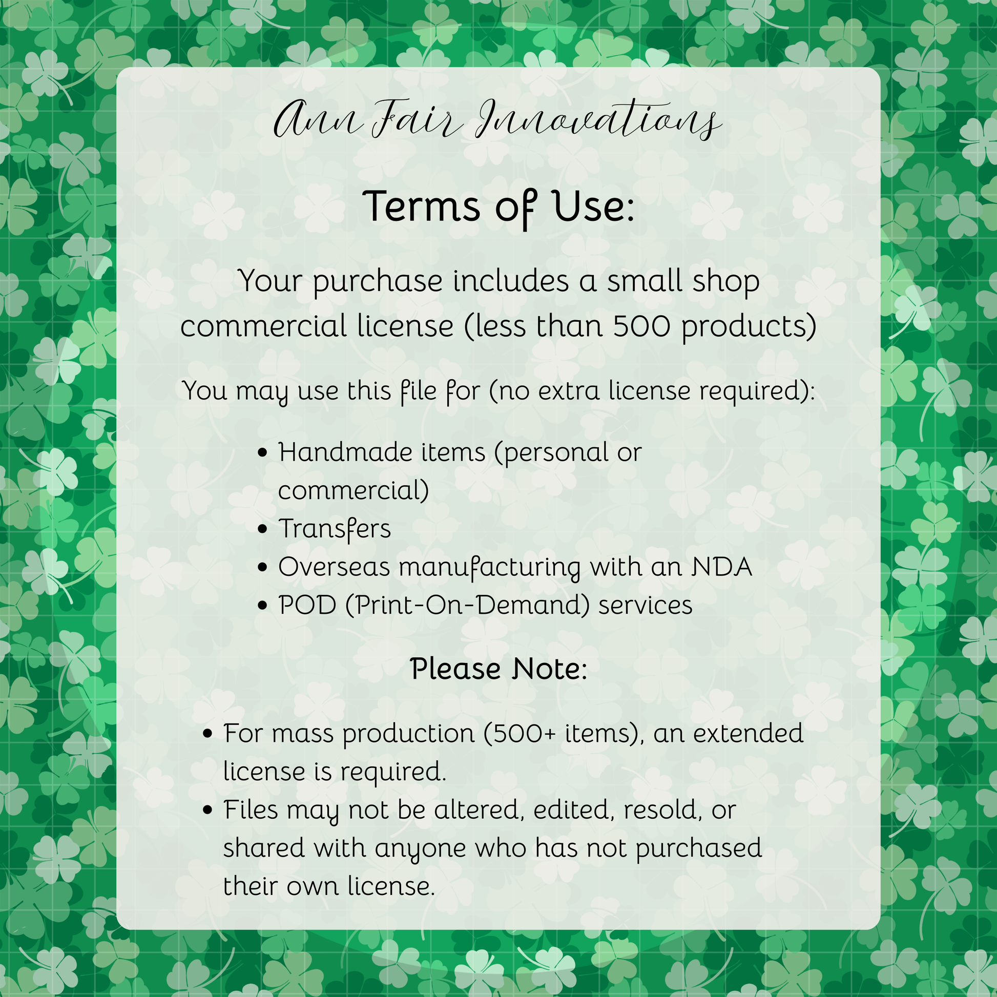 - ✅ Use for handmade products, transfers, POD (print-on-demand), and overseas manufacturing (with NDA)