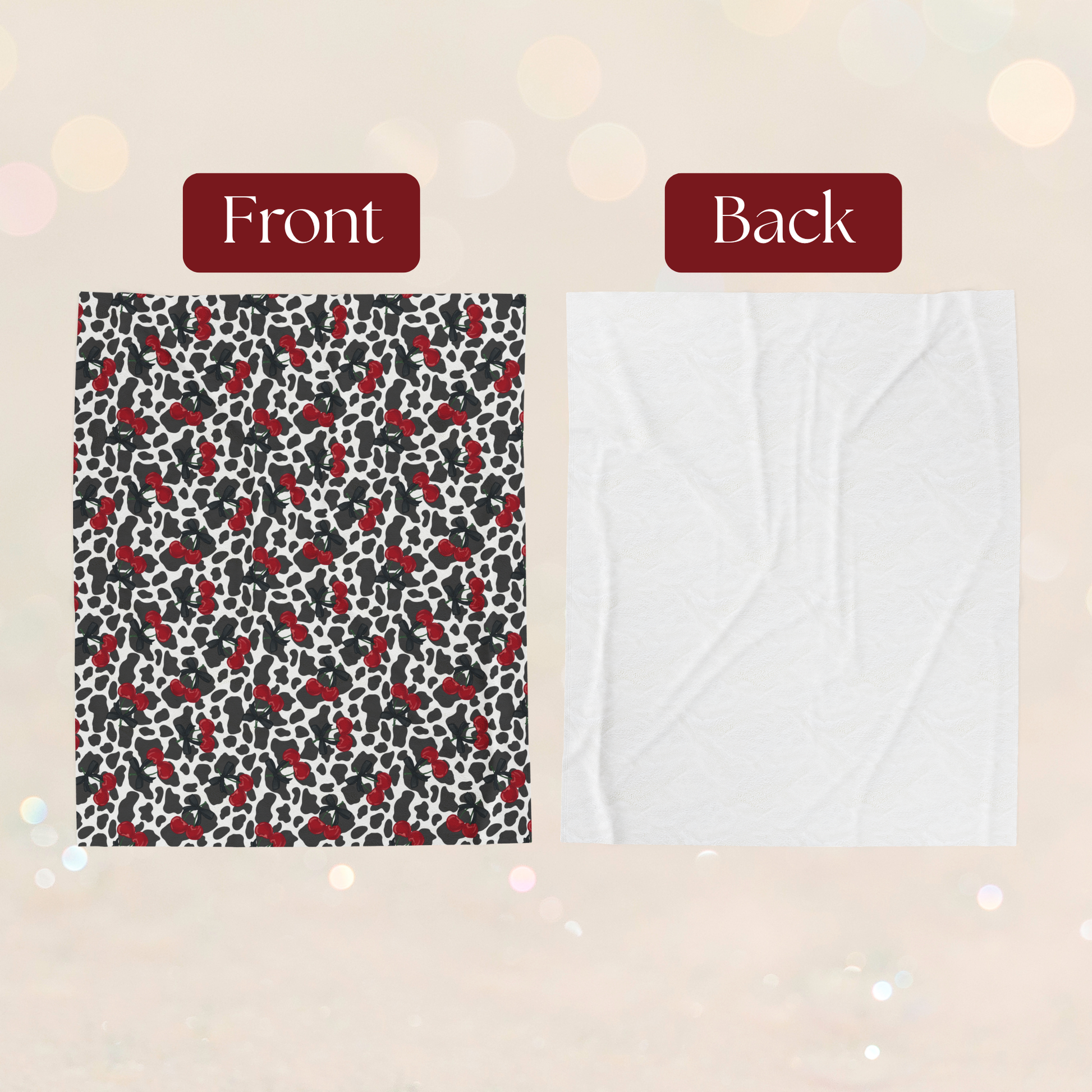 Boujee, fun, and cute cow print and cherries plush blanket with pretty bows. This velveteen plush blanket is perfect for anyone looking for a cozy and stylish addition to their home decor. Ideal for adding warmth and charm to lounging nights or as a statement piece during holidays and special occasions.