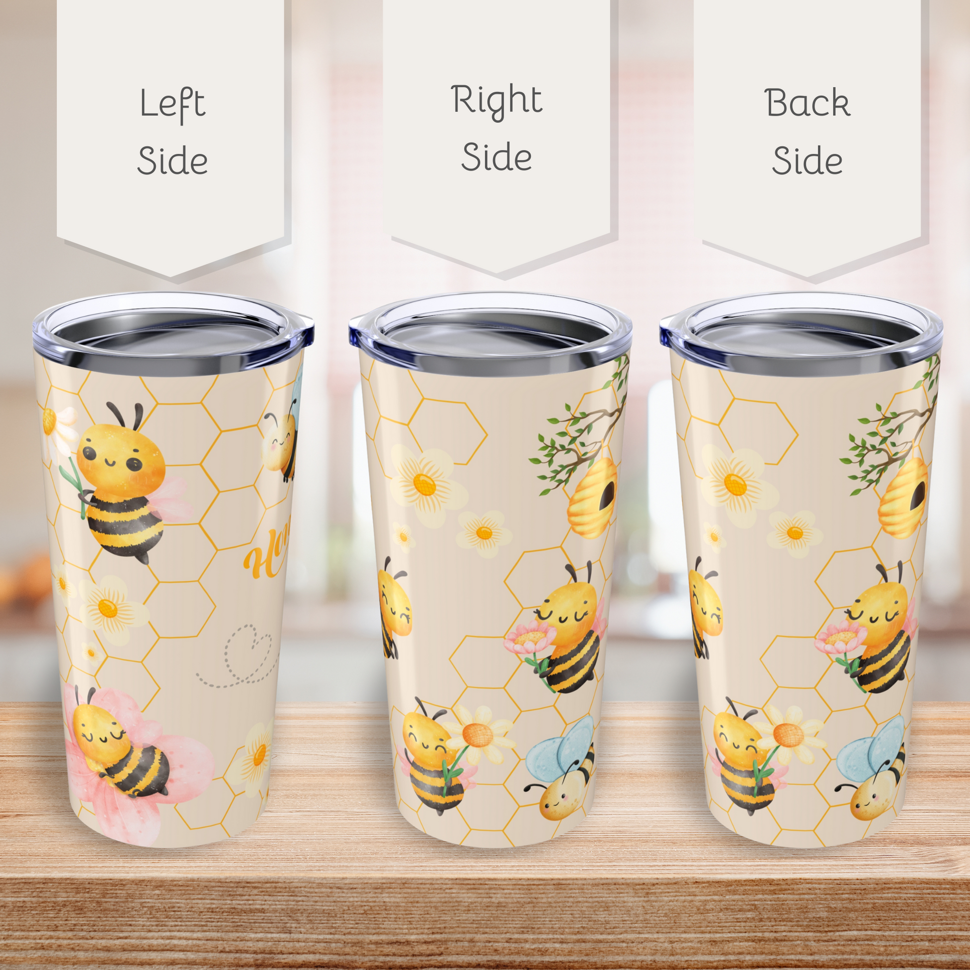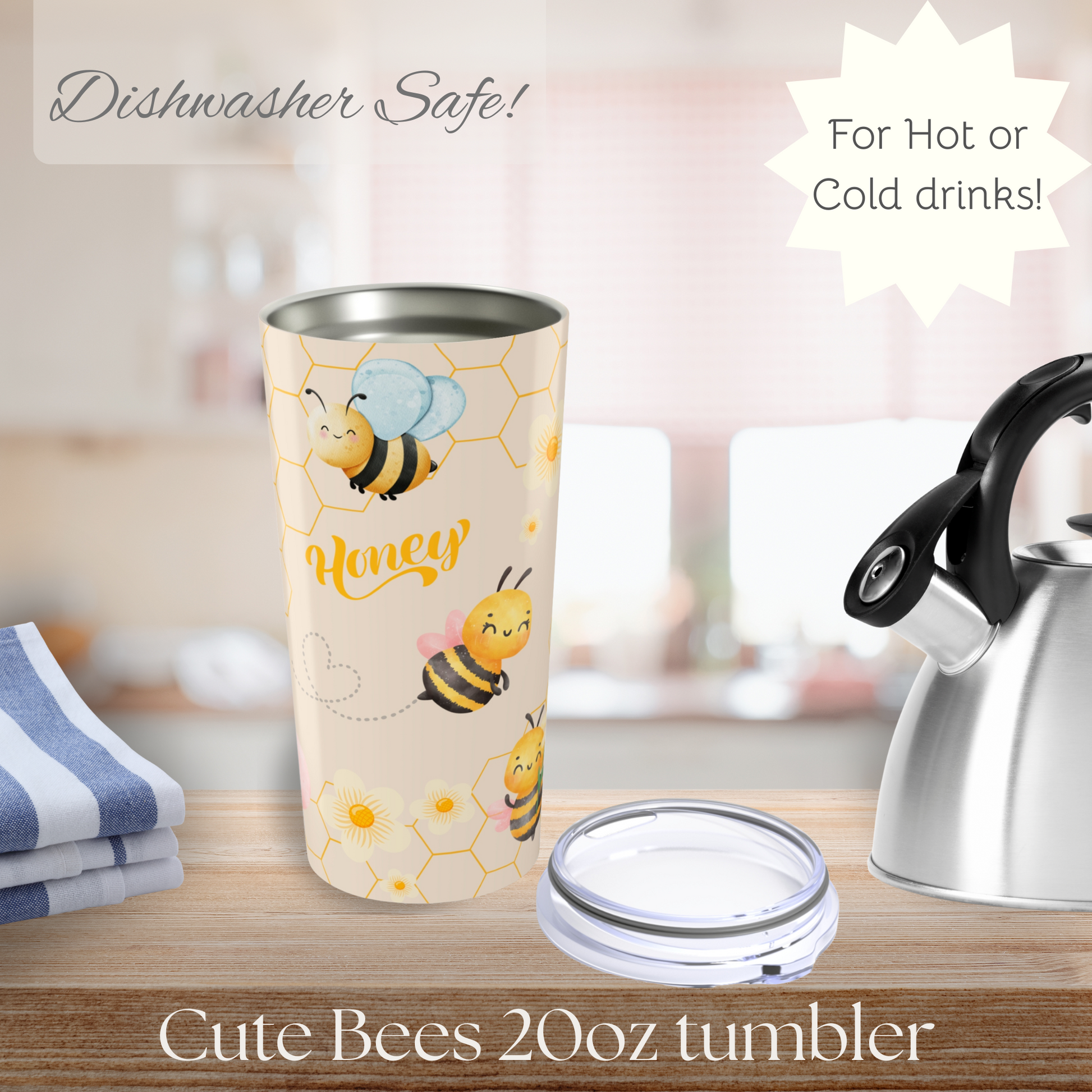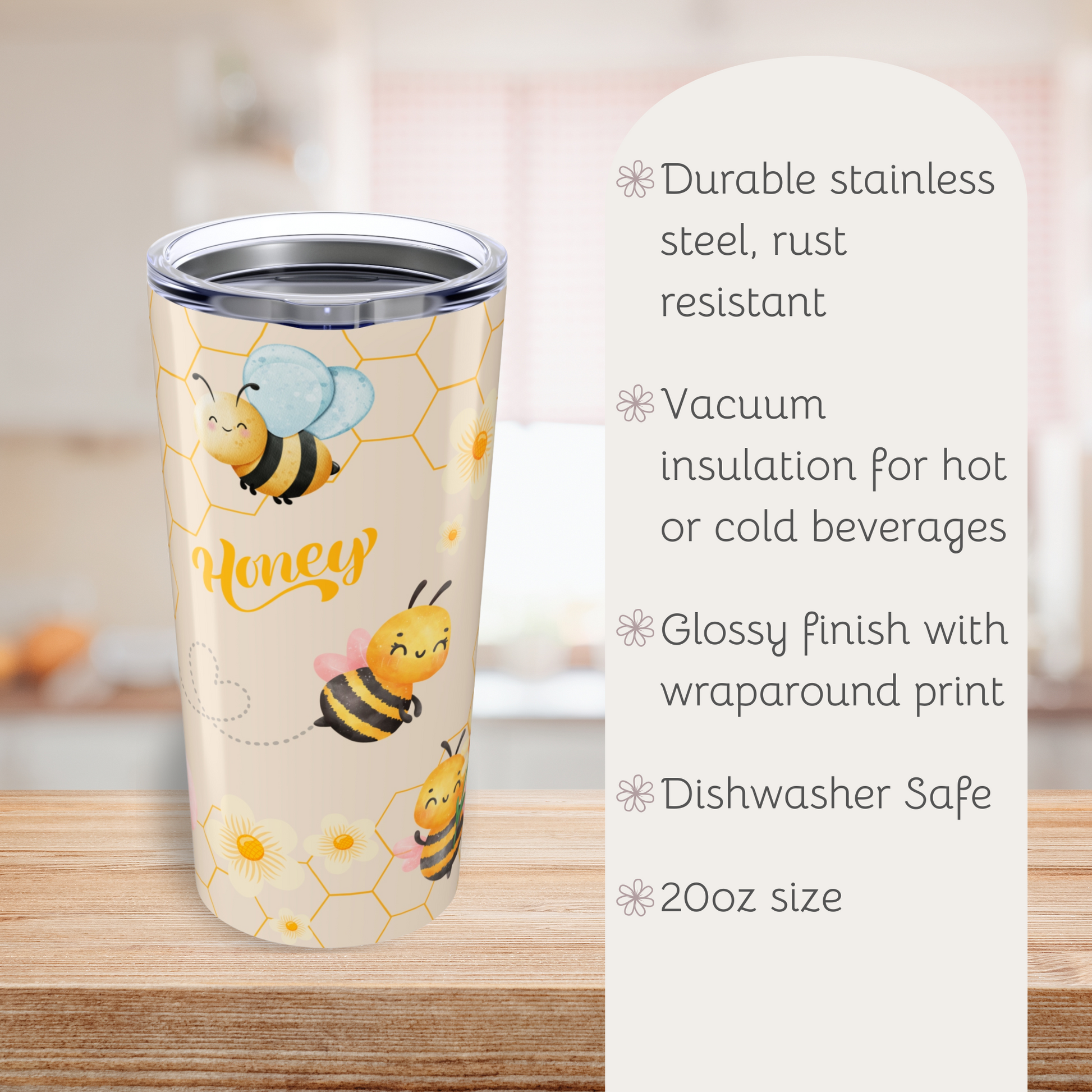 Introducing a stylish 20oz tumbler that combines functionality with fun! Perfectly crafted for those who appreciate a splash of personality in their drinkware, this tumbler features a cute bees pattern against a honeycomb and cream backdrop. Ideal for busy mornings or leisurely afternoons, it keeps your beverages hot or cold, ensuring you stay refreshed all day long. Whether you’re sipping coffee at home or iced tea at the beach, this tumbler fits seamlessly into your lifestyle. It's a fantastic gift for friends, family, or yourself during birthdays, summer outings, or any casual celebration. Embrace the vibrant energy of summer and enjoy your favorite drinks in style!