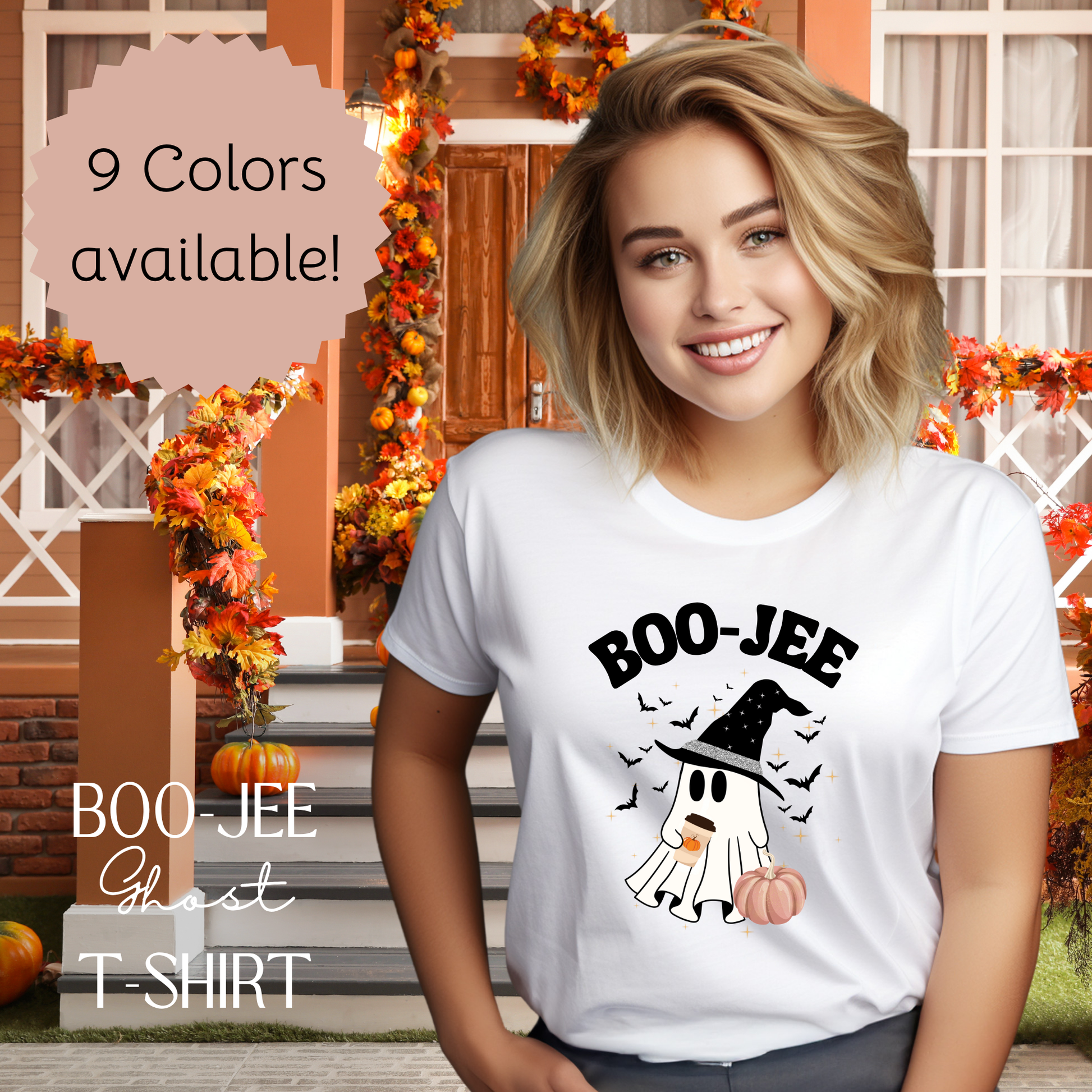 - Cute Halloween ghost design with 'boo-jee' text and pumpkin spice latte