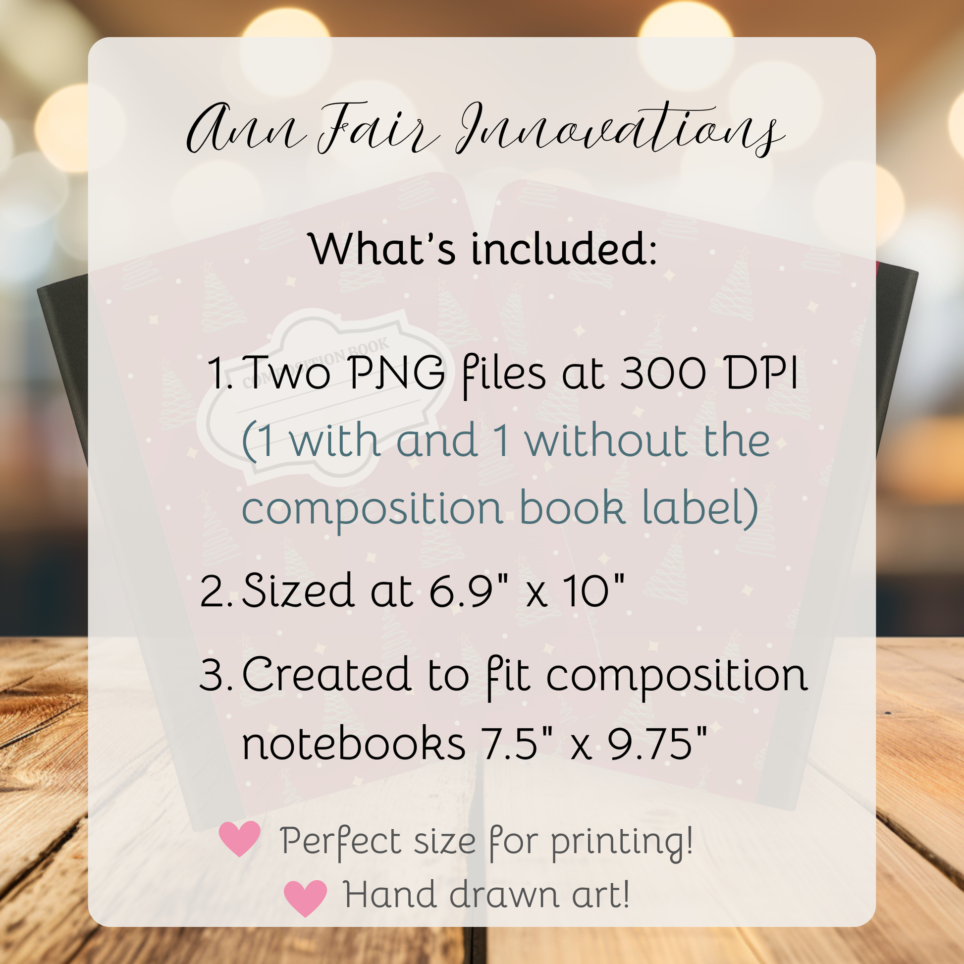 - Sized at 6.9” x 10” to fit standard 7.5” x 9.75” composition notebooks (with trimming room)