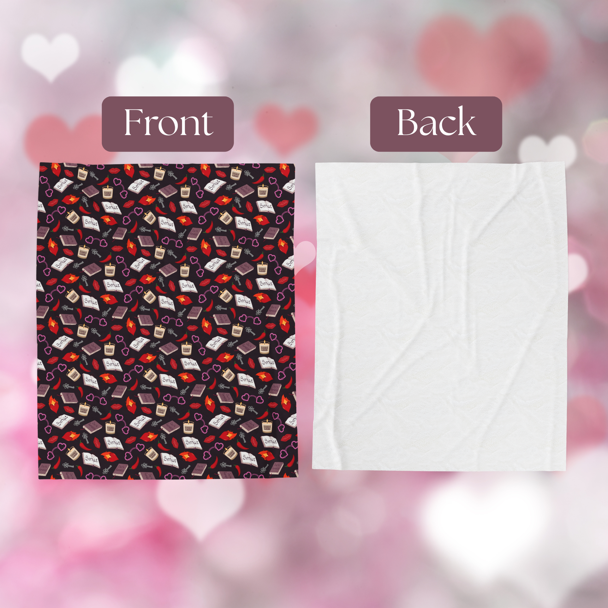 Indulge in dark romance with this My Smutty Valentine plush velveteen throw blanket. Featuring flaming hearts, romance books, candles, hot peppers, heart handcuffs, and red lips on a black background, this ultra soft throw blanket showcases your spicy side. Perfect for adults who enjoy forbidden love stories, this blanket is ideal for Valentine's Day, anniversary gifts, or adding a touch of passion to your bedroom decor.