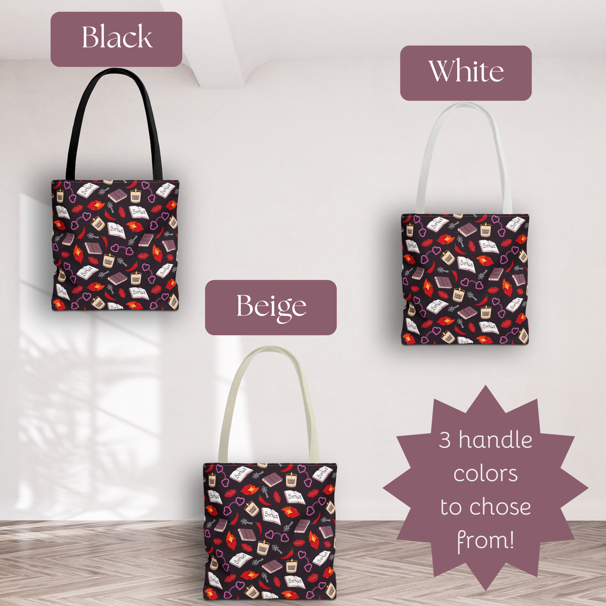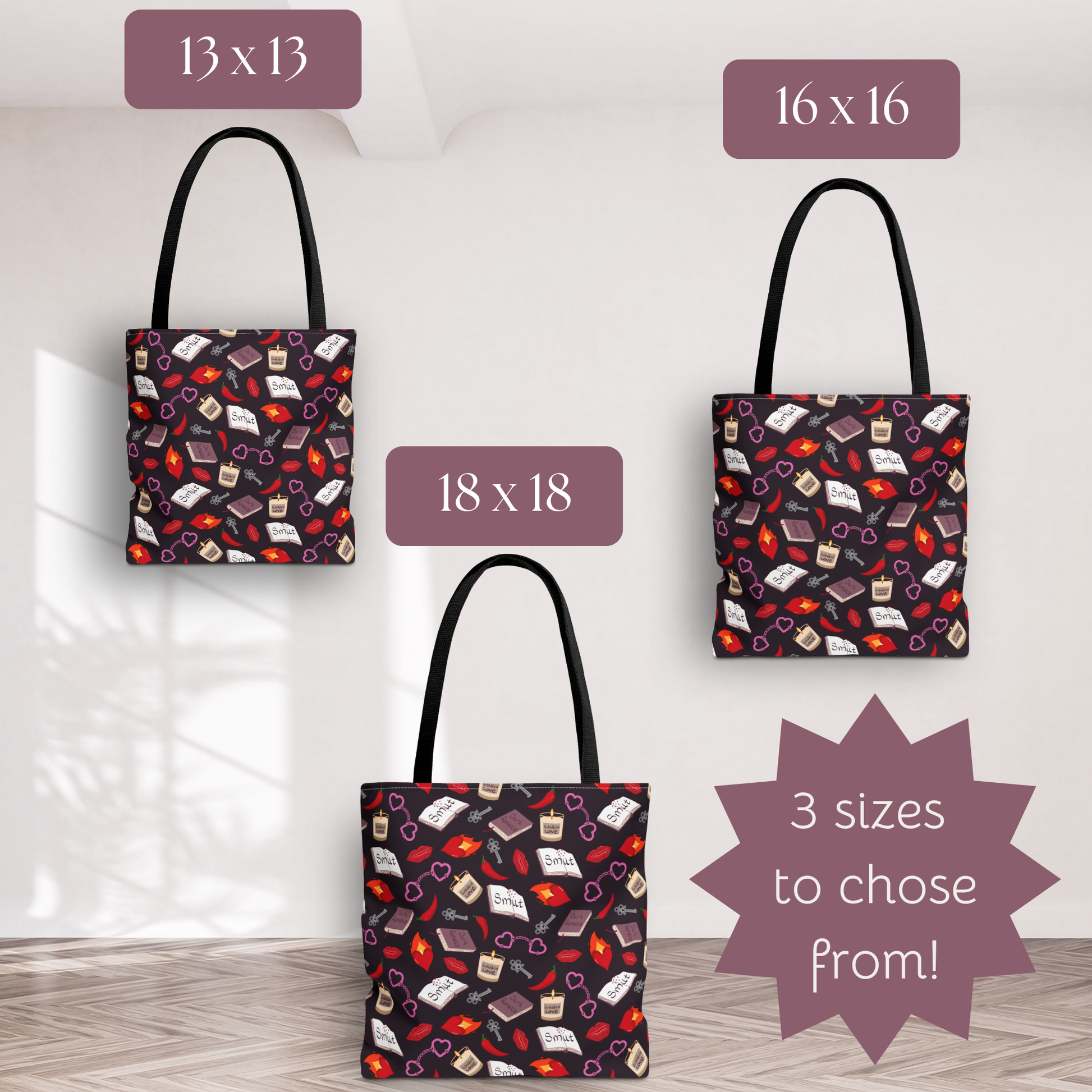 My Smutty Valentine tote bag in 3 sizes for all the Dark romance and forbidden love fans. Featuring books, candles, heart handcuffs, flaming hearts, hot peppers, and lips against a black background. Show off your spicy side with this hand-drawn pattern. Perfect for everyday use or as a unique gift for Valentine's Day or lovers of dark romance.