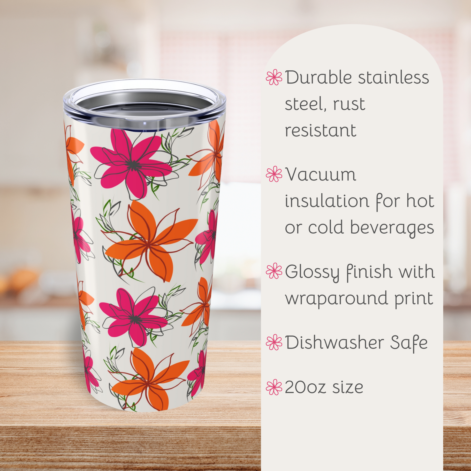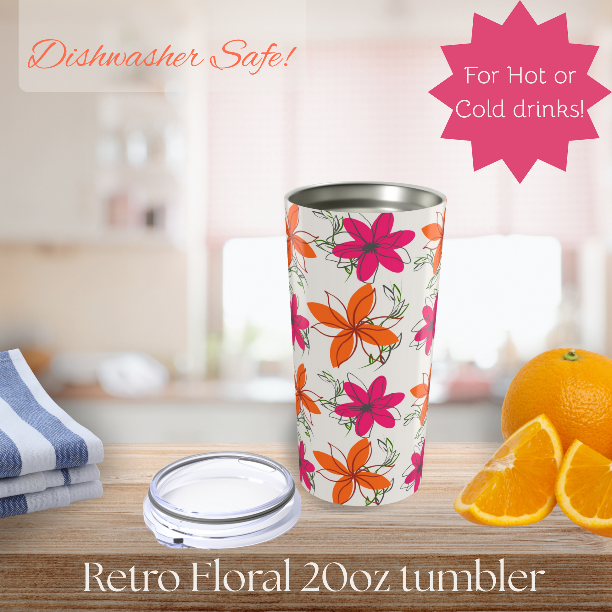 Introducing a stylish 20oz tumbler that combines functionality with fun! Perfectly crafted for those who appreciate a splash of personality in their drinkware, this tumbler features a fun retro floral pattern against a cream backdrop. Ideal for busy mornings or leisurely afternoons, it keeps your beverages hot or cold, ensuring you stay refreshed all day long. Whether you’re sipping coffee at home or iced tea at the beach, this tumbler fits seamlessly into your lifestyle. It's a fantastic gift for friends, family, or yourself during birthdays, summer outings, or any casual celebration. Embrace the vibrant energy of summer and enjoy your favorite drinks in style!