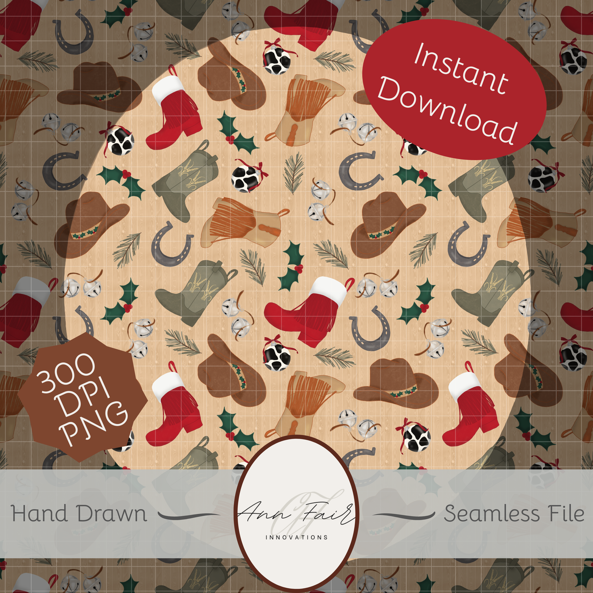 Western Christmas Seamless Hand Drawn Digital Pattern | 300 DPI PNG | Instant Download