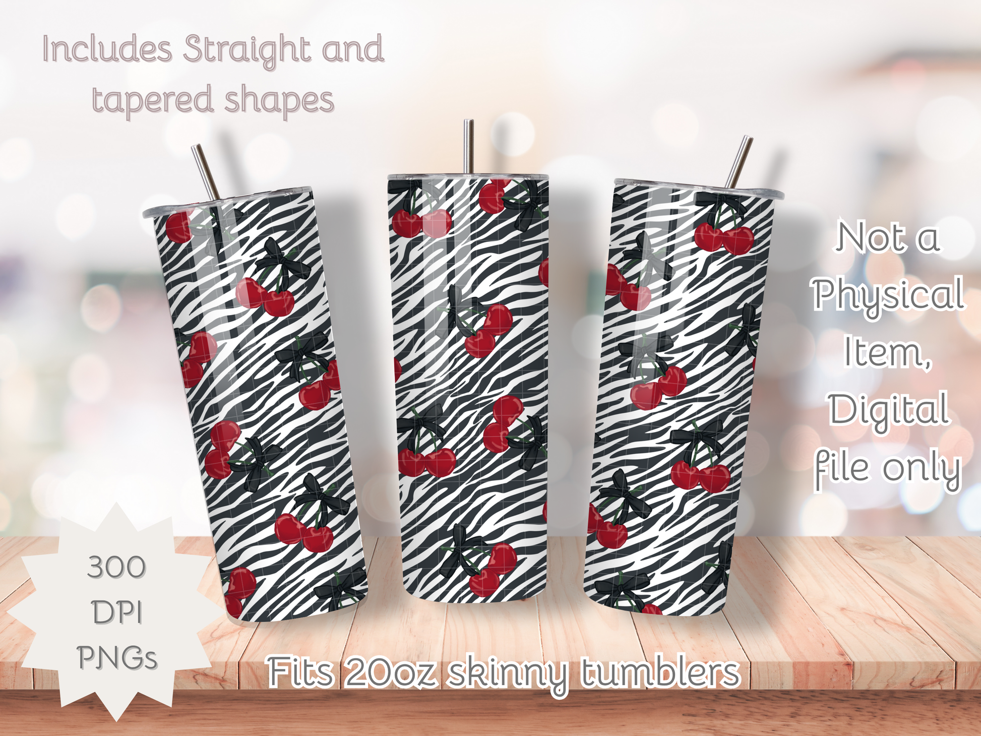 Zebra Print and Cherries Seamless PNG 20oz Skinny Tumbler Wrap | Sublimation 300 DPI Straight Tumbler Wrap | PNG Digital Wrap Digital Download